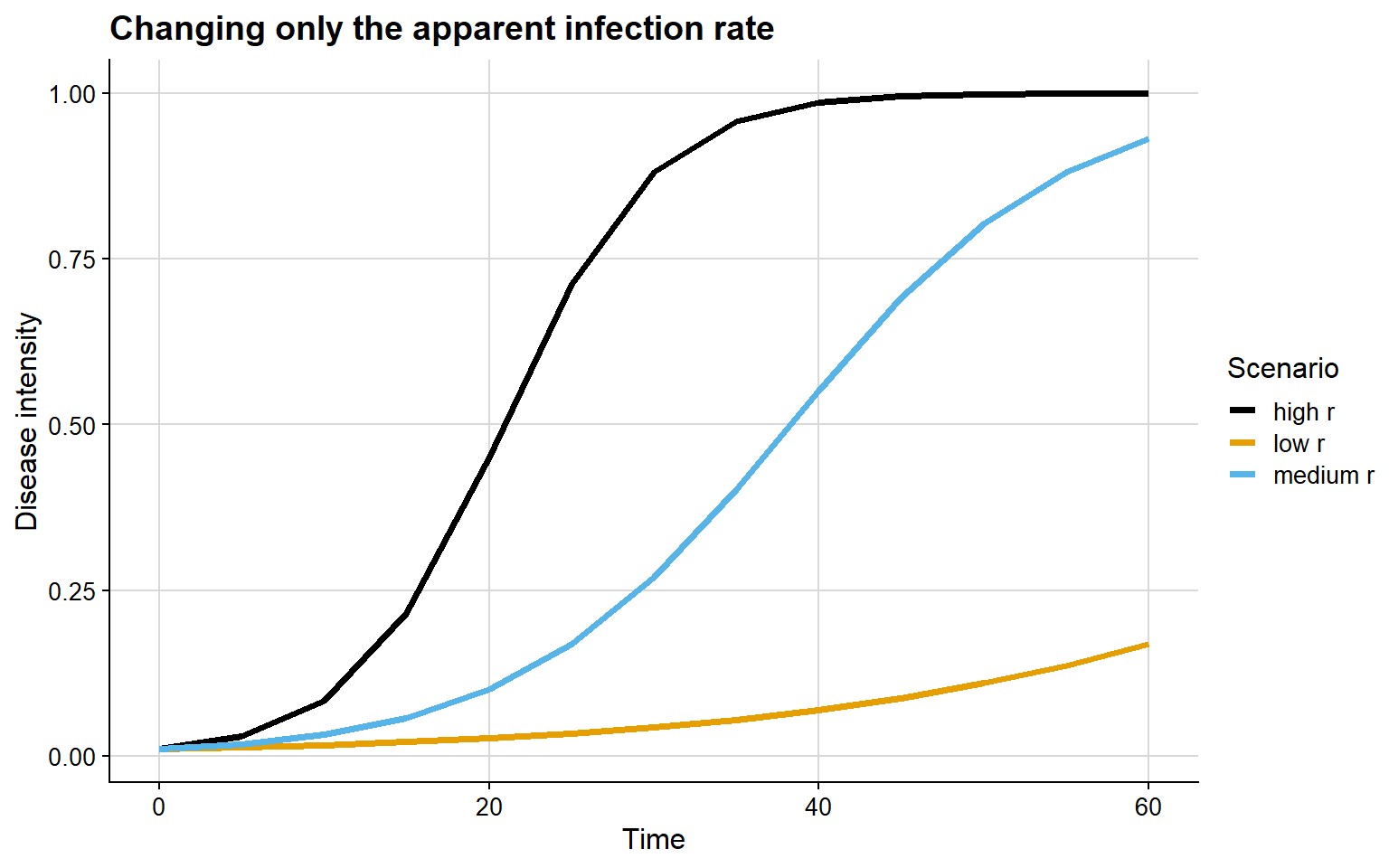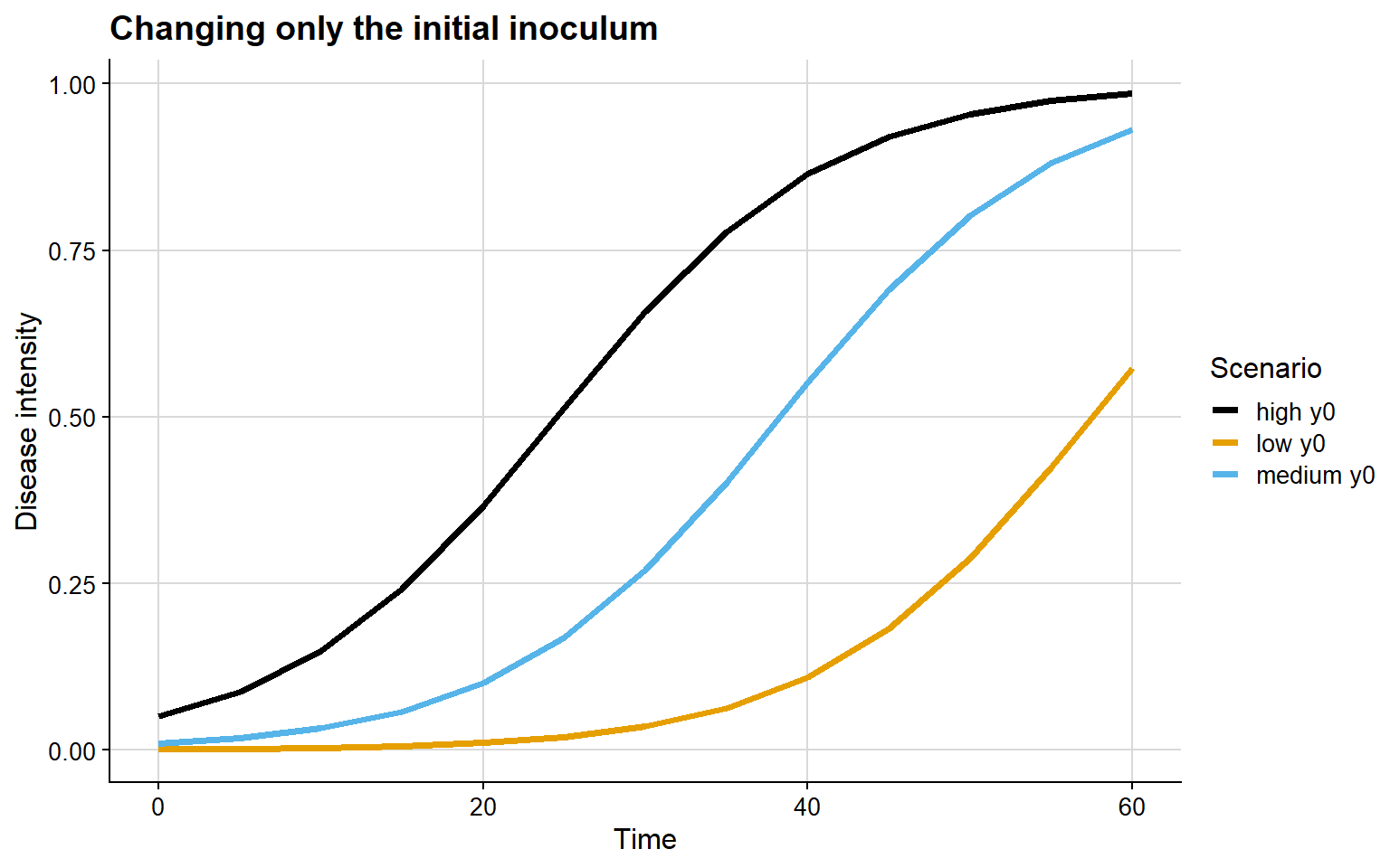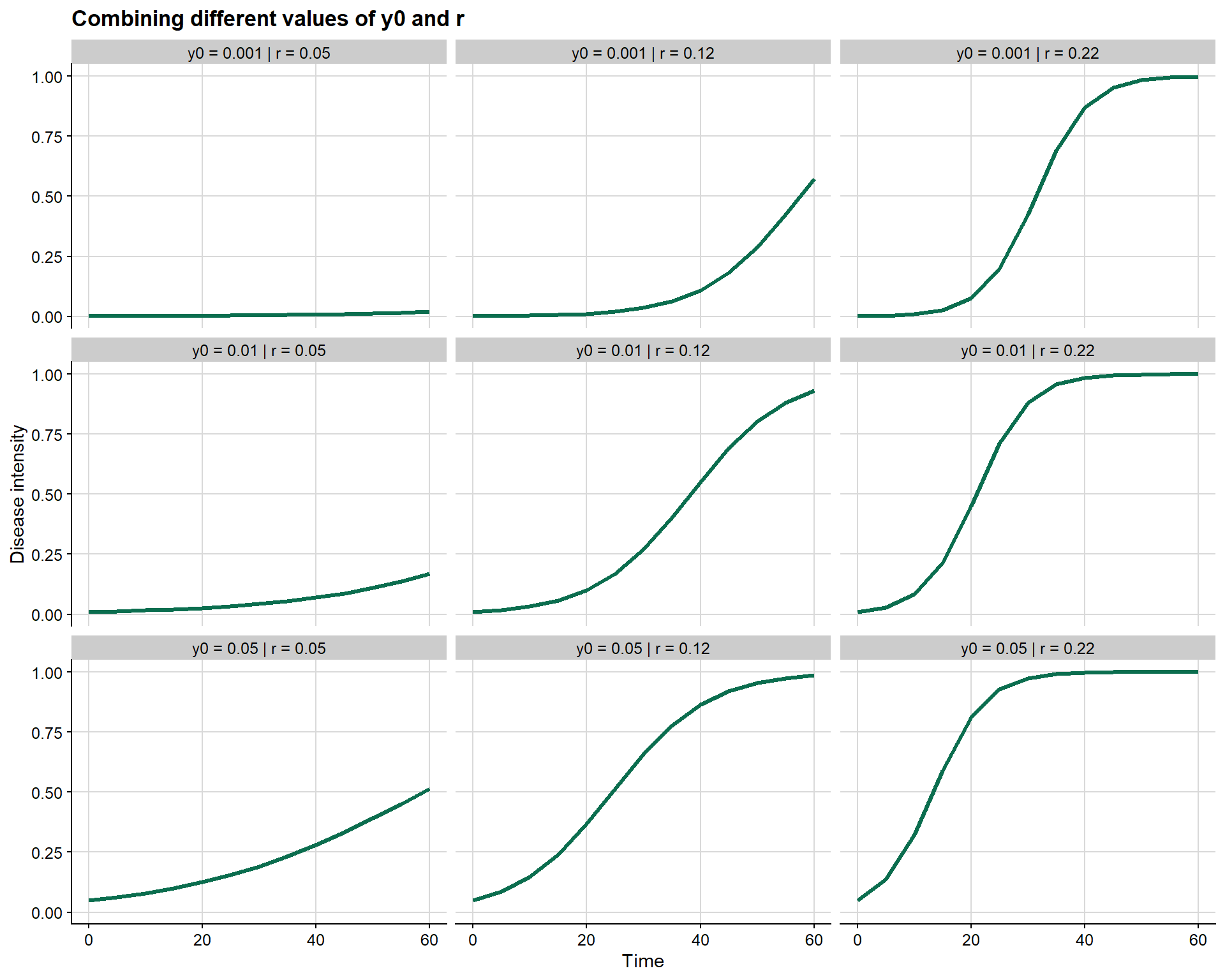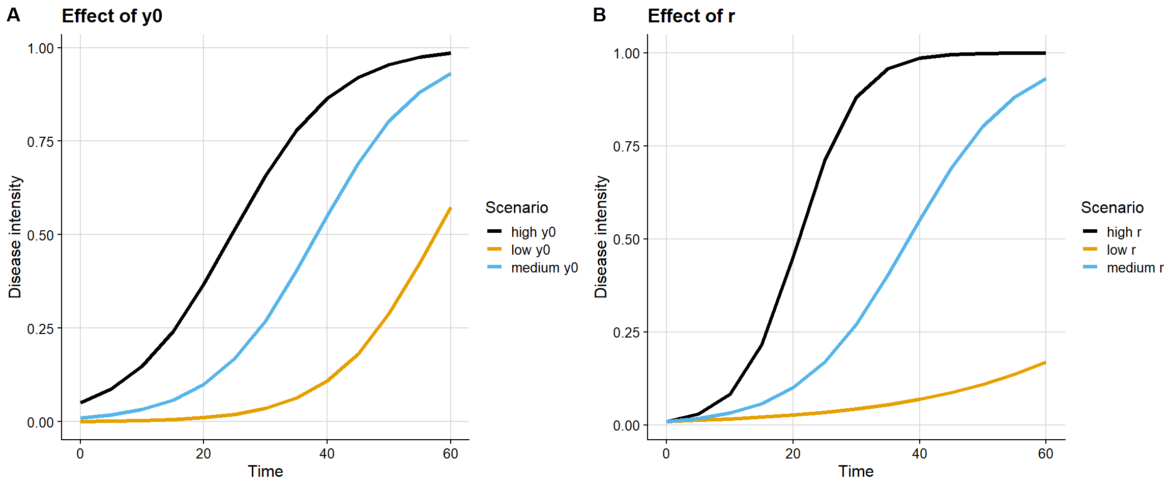 If y0 defines the initial condition, r controls how quickly the epidemic expands. In disease progress models, r is usually interpreted as an aggregate parameter of epidemic efficiency, reflecting how strongly disease increases through time within the structure of the chosen model.