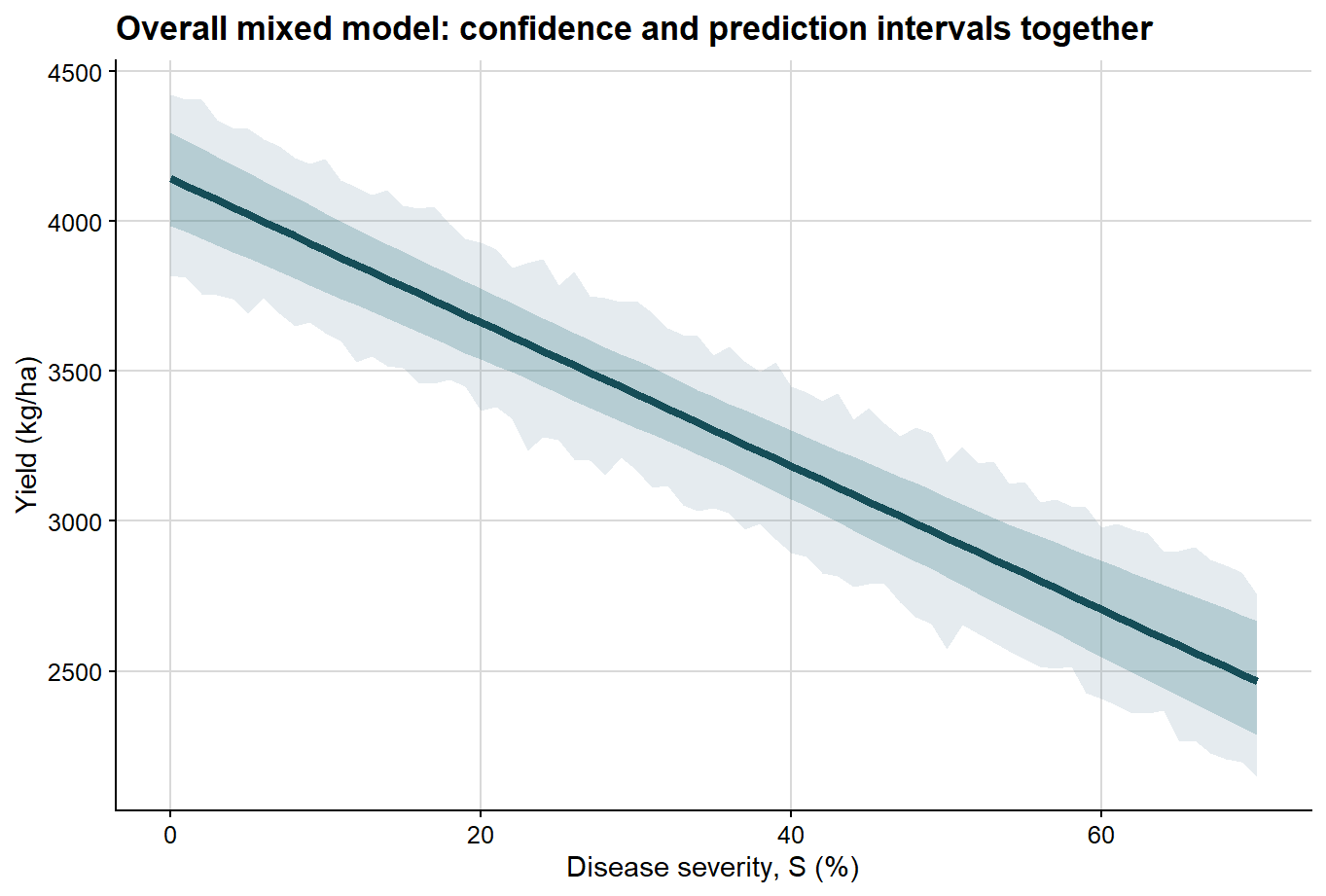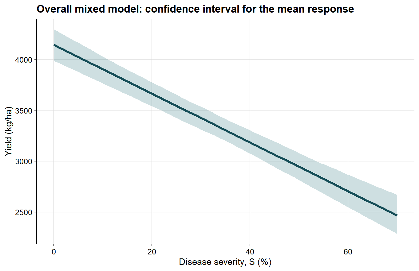 The first step is deliberately simple: fit a mixed model with severity as the only fixed-effect predictor. This yields a population-average attainable yield and a population-average slope while still accounting for study-to-study heterogeneity through random effects.