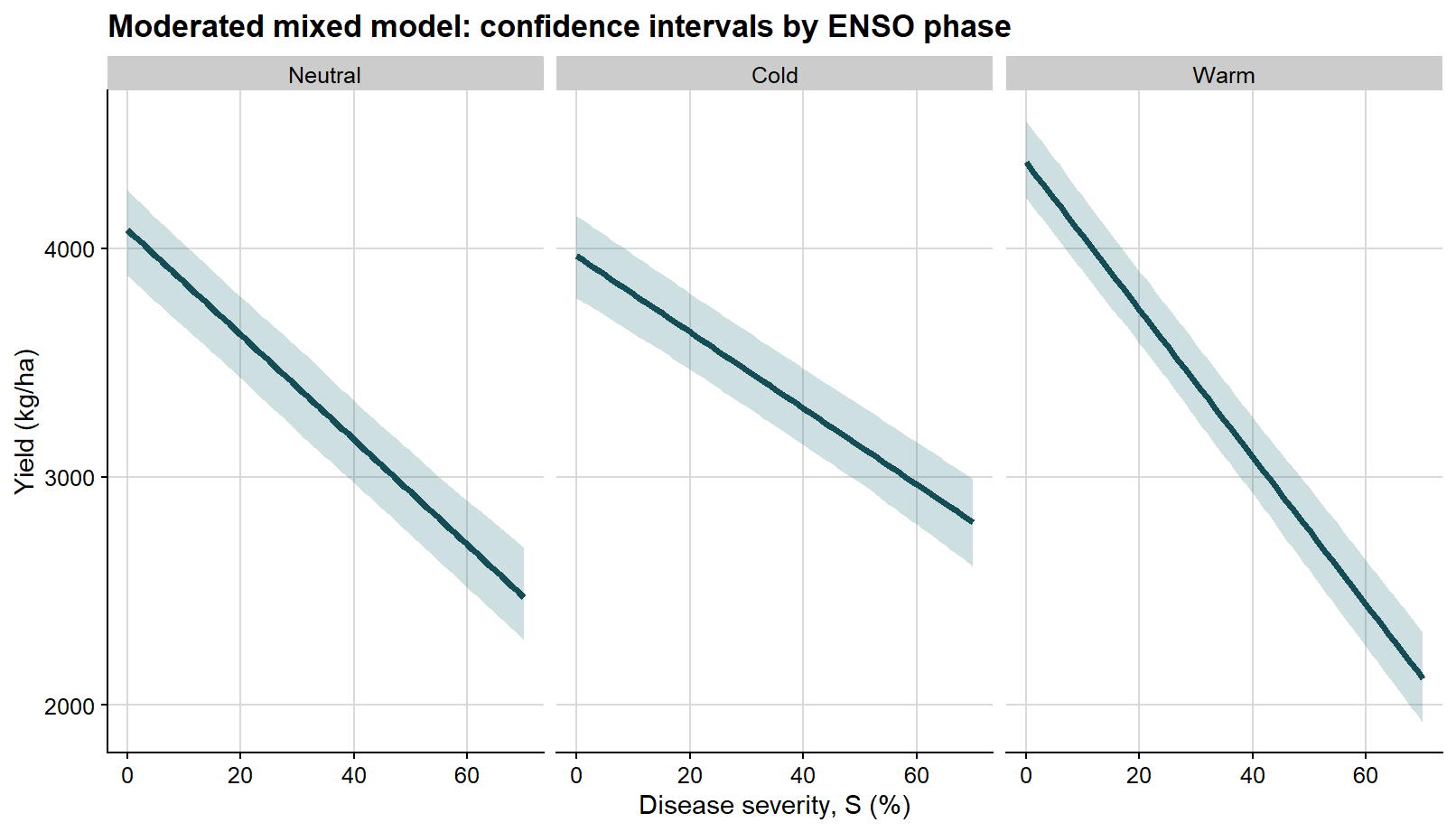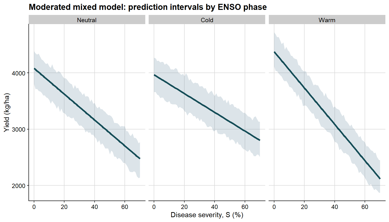 The biological premise is straightforward: increasing disease burden is generally associated with declining yield. However, the epidemiological interpretation depends strongly on how that relationship is parameterized and on which quantity is treated as the inferential target.