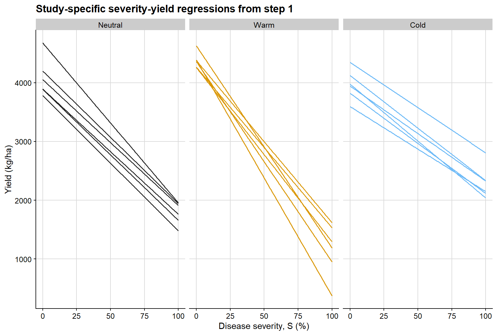 This question is fundamental for crop-loss assessment, breeding prioritization, cultivar evaluation, and disease management decision-making. It is also statistically nontrivial, because the severity-yield relationship is rarely estimated from a single homogeneous experiment. In most practical settings, yield loss datasets are hierarchical, with multiple studies, years, environments, and disease pressure scenarios contributing to substantial heterogeneity in both attainable yield and disease response.