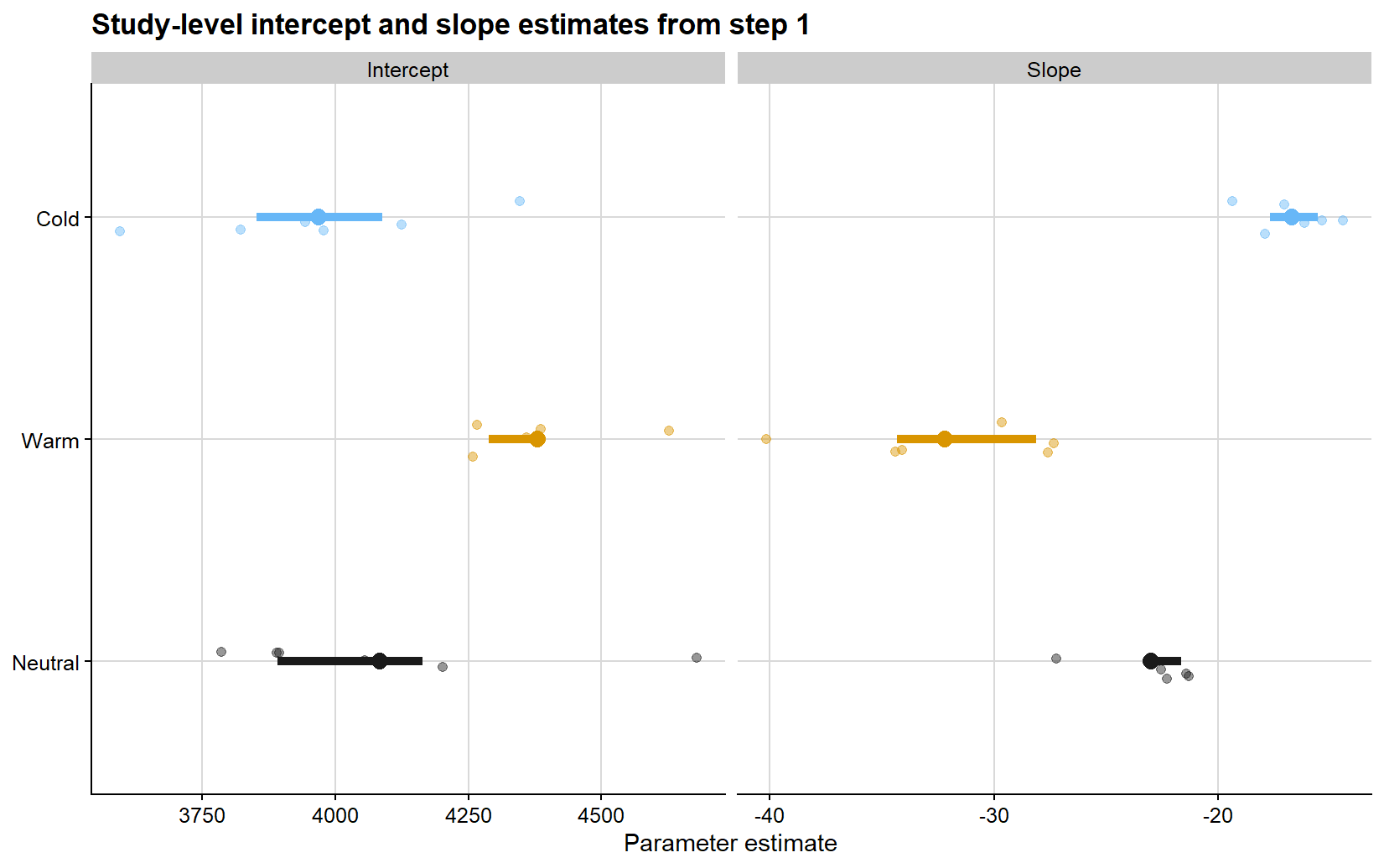 ggplot(meta_summary, aes(x = enso, y = estimate, color = enso)) +geom_point(size =3) +geom_errorbar(aes(ymin = ci_lb, ymax = ci_ub), width =0.08, linewidth =0.8) +scale_color_colorblind() +background_grid() +labs(title ="Meta-analytic estimates of the damage coefficient",x ="ENSO phase",y ="Damage coefficient (% yield loss per 1% severity)",color ="ENSO phase" ) +theme(legend.position ="none")