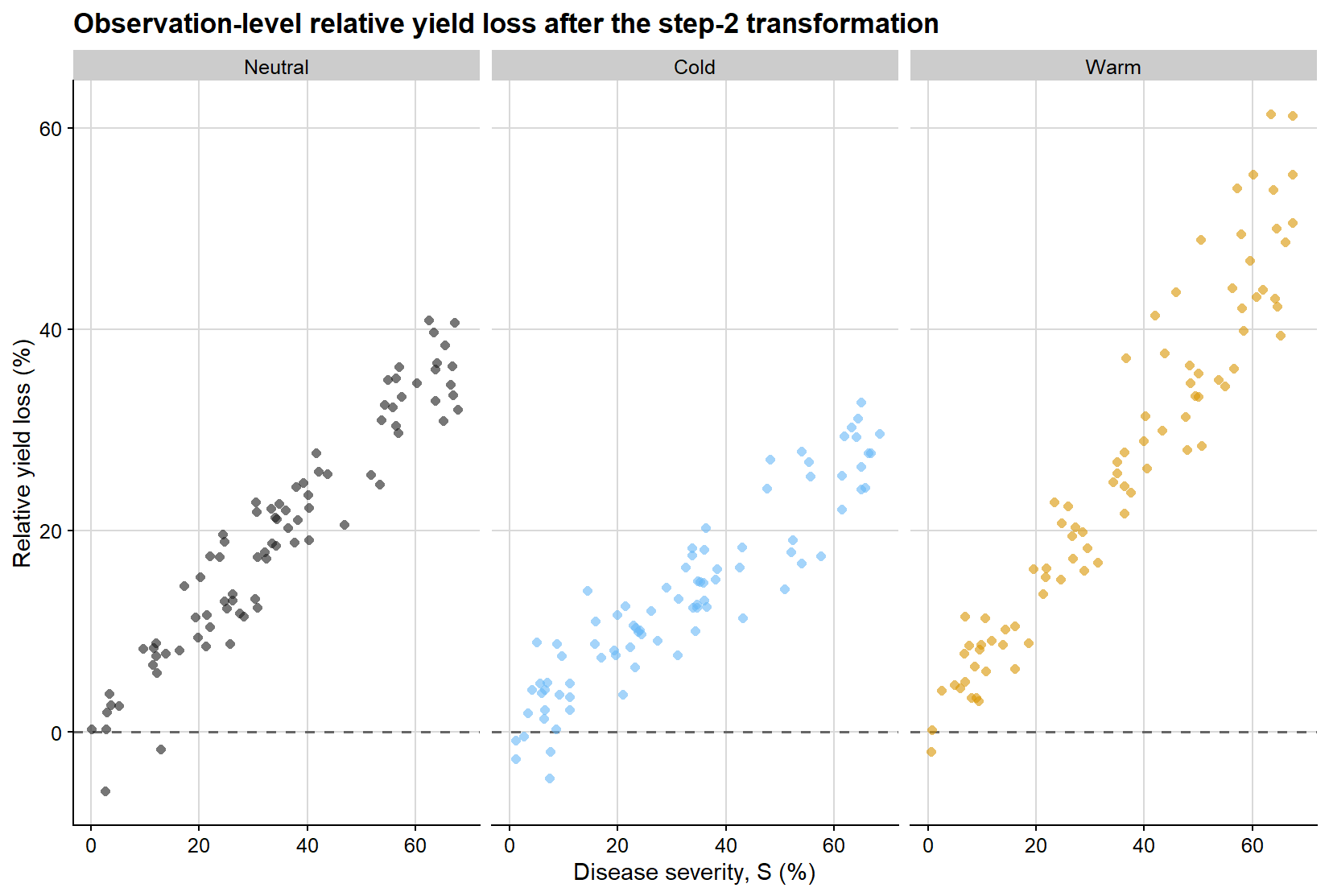 From this formulation, we often derive the damage coefficient, a relative measure that expresses the proportional reduction in yield associated with each 1 percentage-point increase in disease: