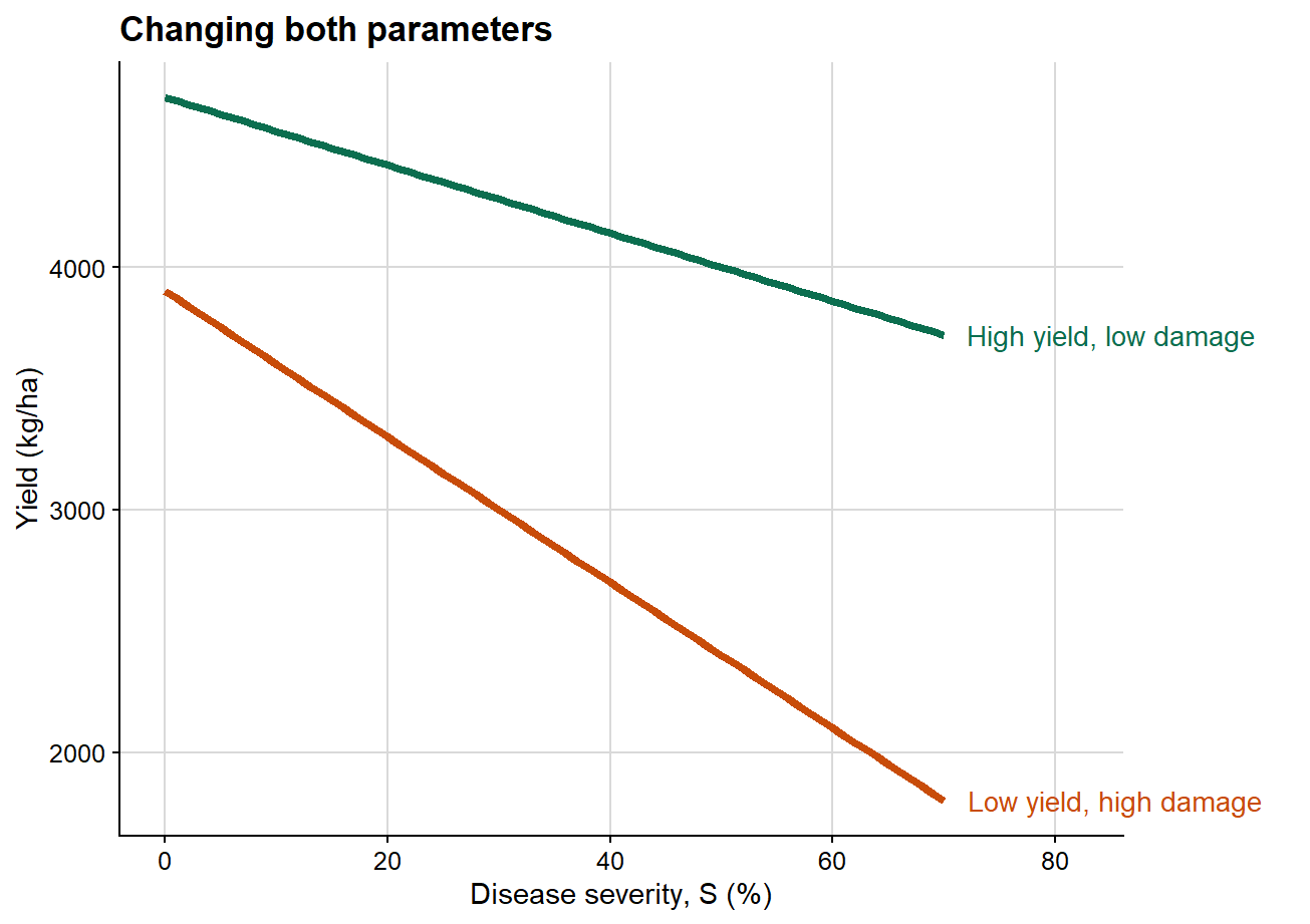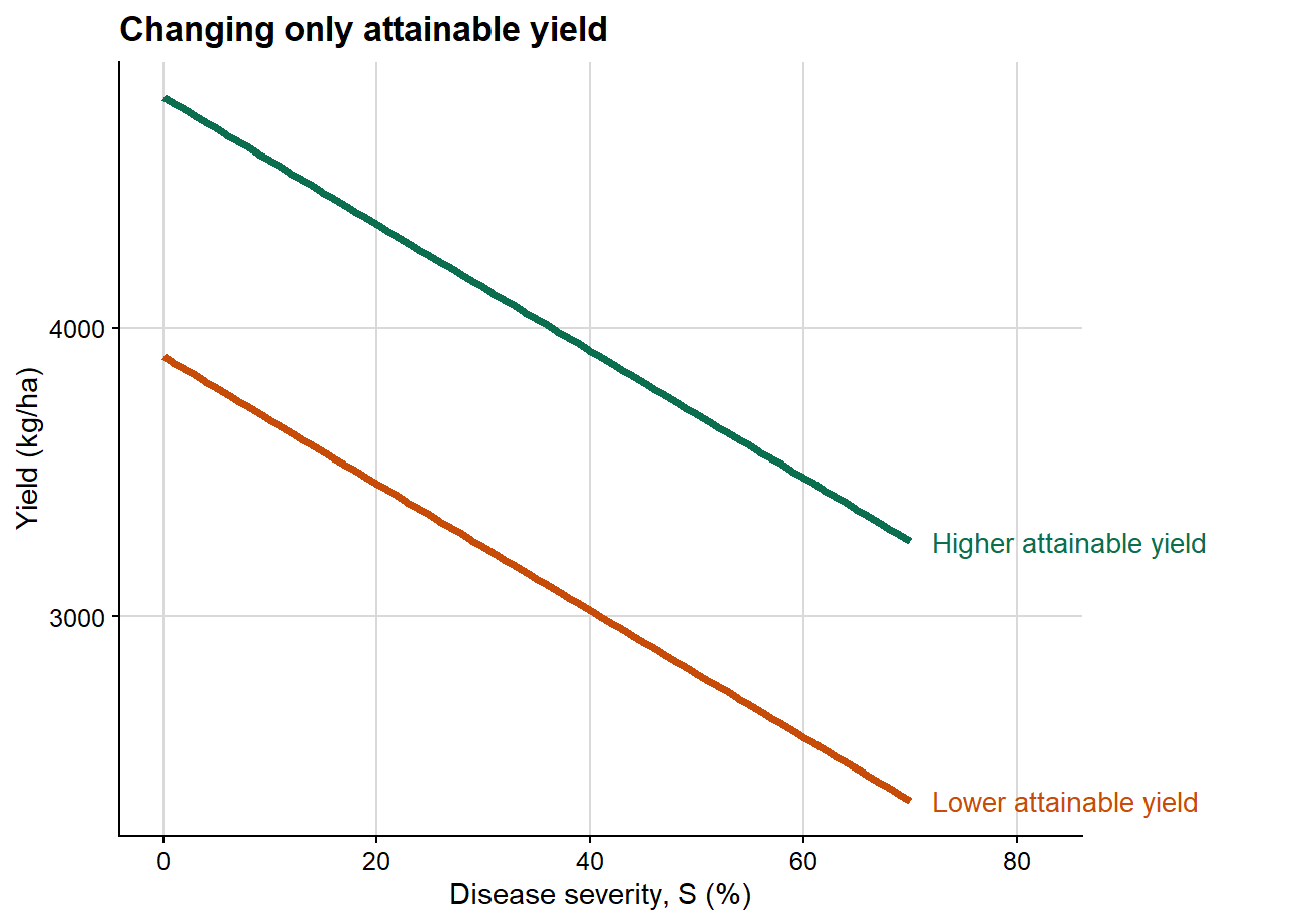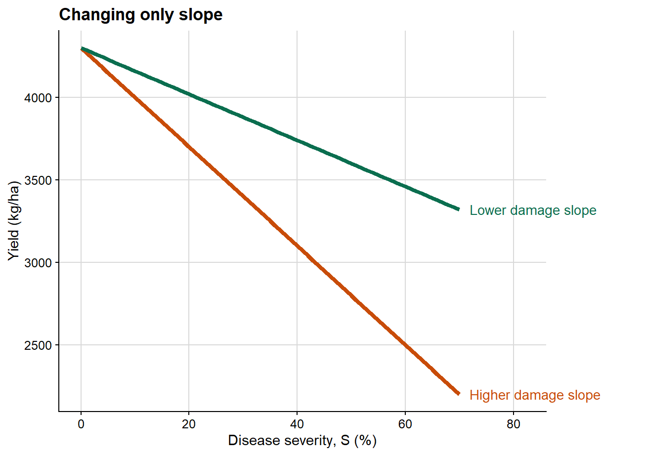 Here the intercept is identical in both scenarios, so attainable yield is unchanged. What differs is the rate at which yield declines as severity increases. This is the clearest graphical representation of the epidemiological meaning of the damage slope.