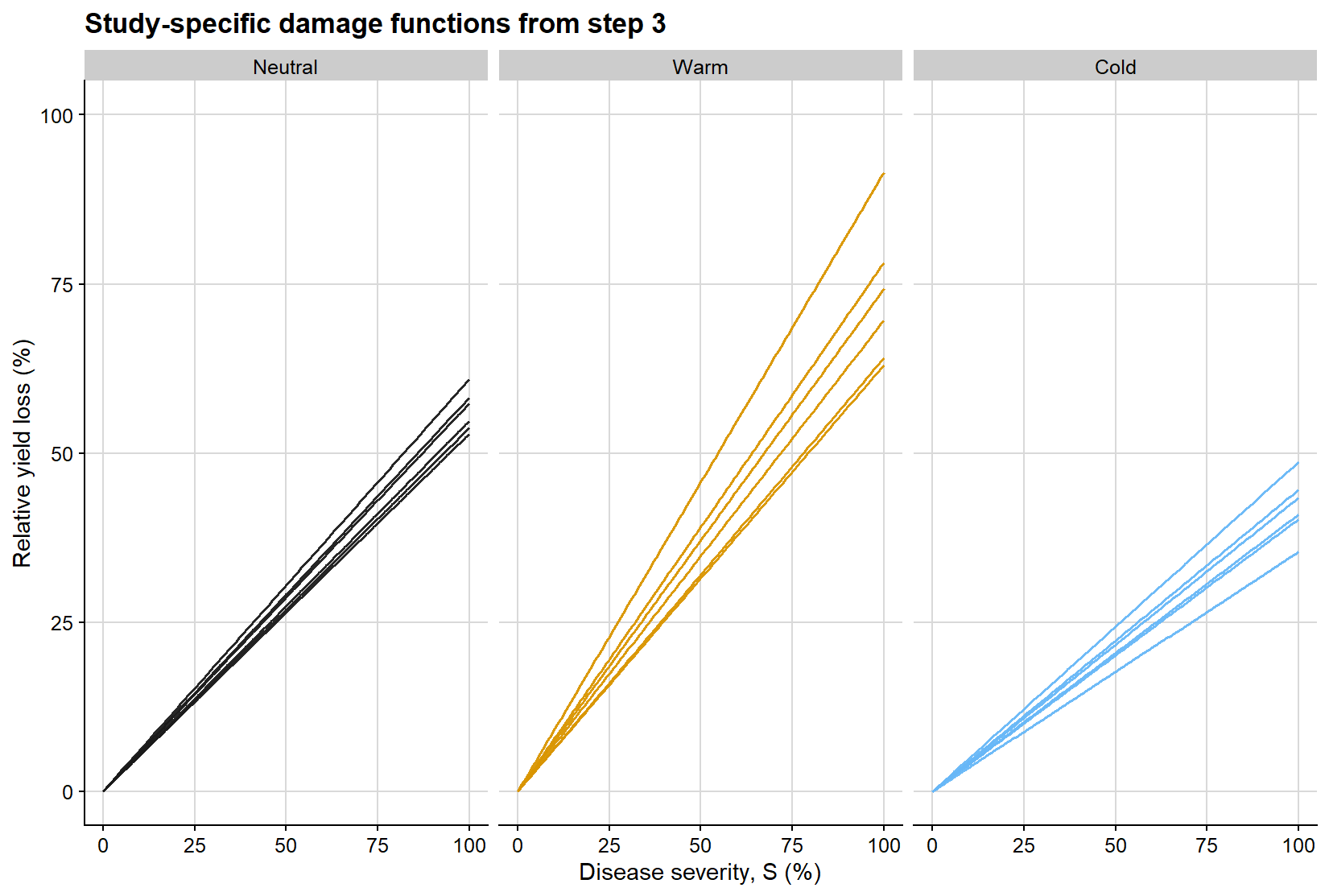 ggplot(dc_line_grid, aes(severity, relative_loss, group = study, color = enso)) +geom_line(linewidth =0.55, alpha =0.95, show.legend =FALSE) +facet_wrap(~enso, nrow =1) +scale_color_manual(values = enso_palette) +coord_cartesian(xlim =c(0, 100), ylim =c(0, 100)) +background_grid() +labs(title ="Study-specific damage functions from step 3",x ="Disease severity, S (%)",y ="Relative yield loss (%)" )