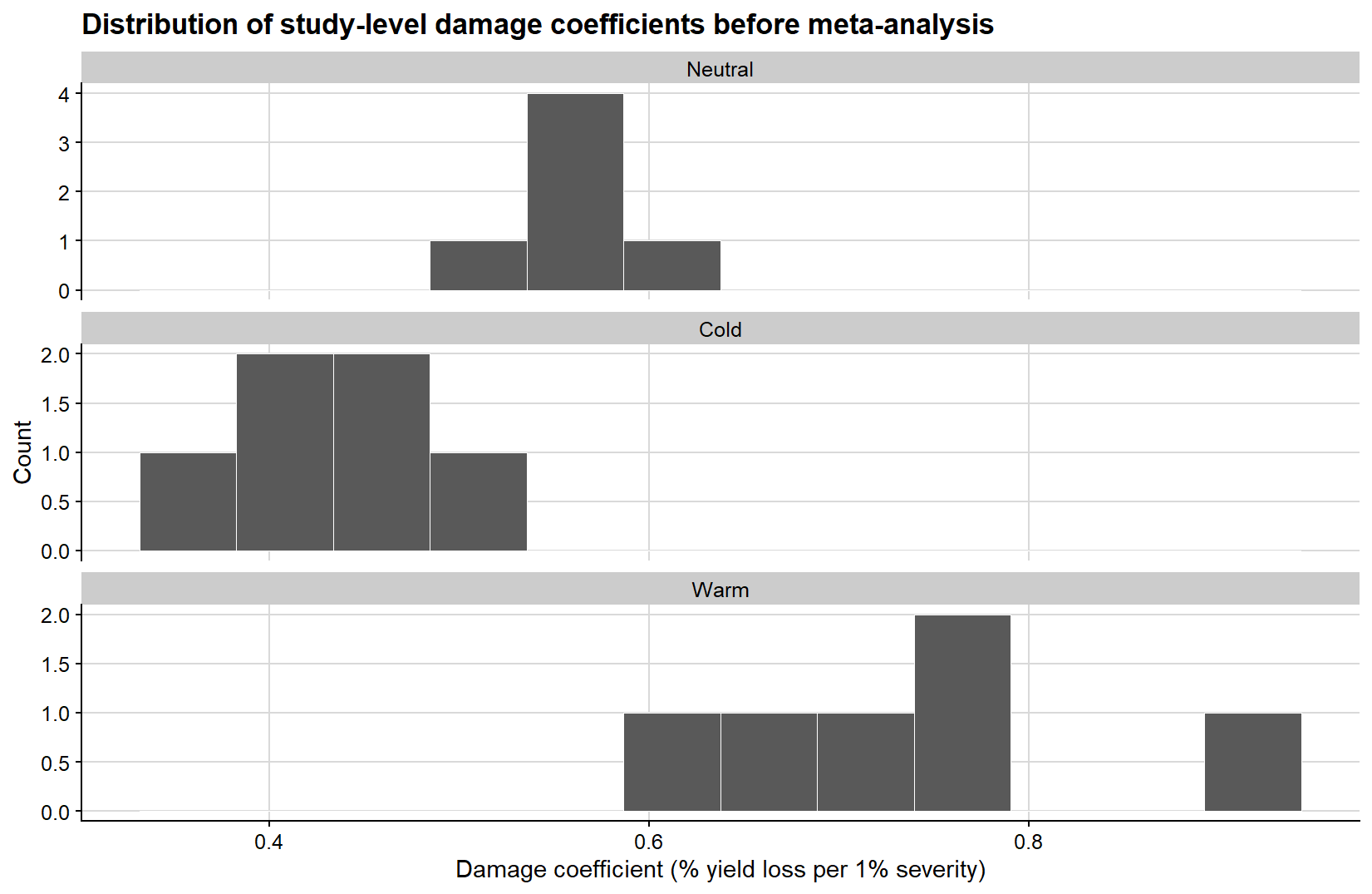 ggplot(study_effects, aes(damage_coefficient)) +geom_histogram(bins =12, fill ="grey35", color ="white", linewidth =0.2) +facet_wrap(~enso, ncol =1, scales ="free_y") +background_grid() +labs(title ="Distribution of study-level damage coefficients before meta-analysis",x ="Damage coefficient (% yield loss per 1% severity)",y ="Count" )