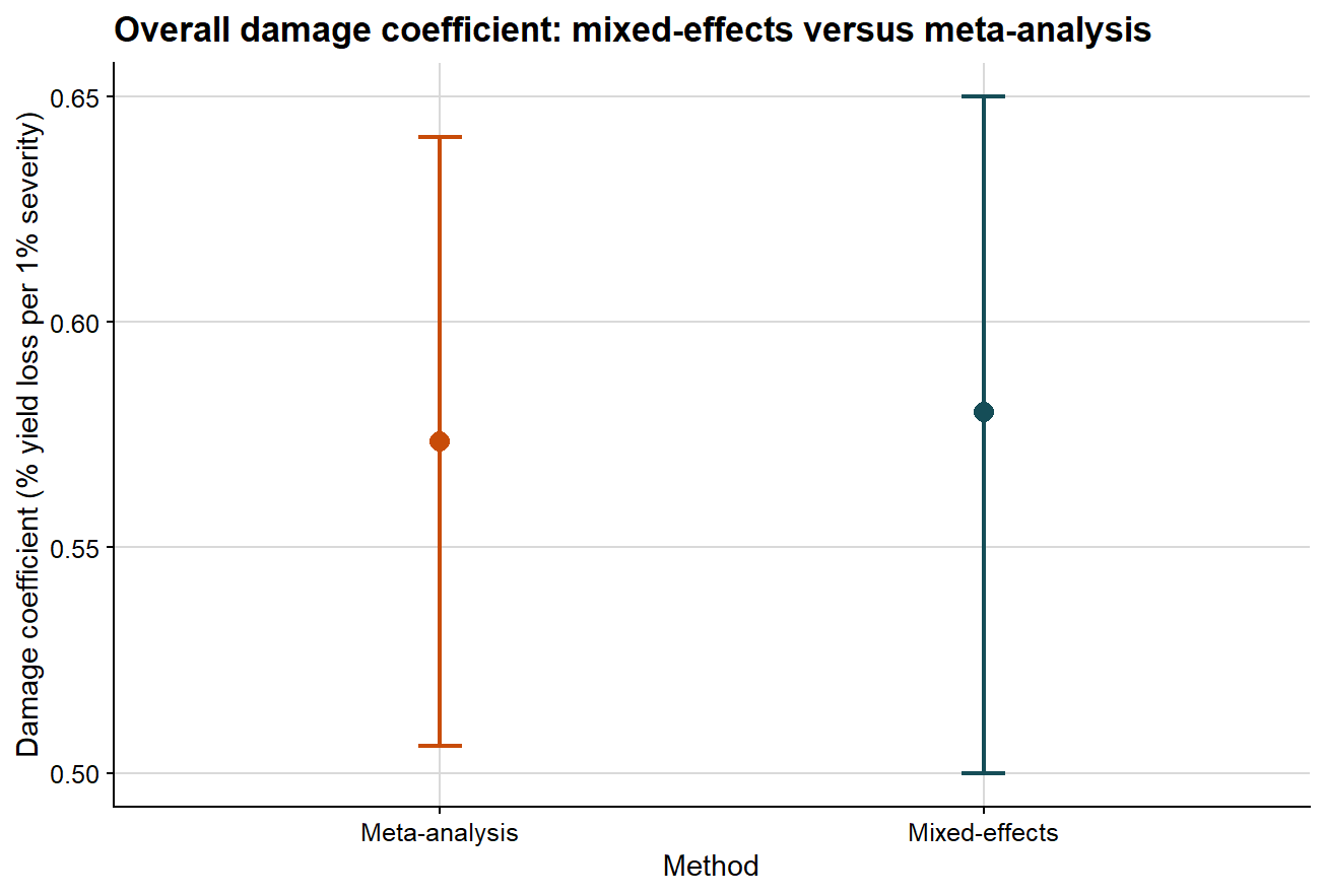 ggplot(overall_compare, aes(x = method, y = estimate, color = method)) +# point estimate from each methodgeom_point(size =3.2) +# uncertainty interval from each methodgeom_errorbar(aes(ymin = ci_lb, ymax = ci_ub), width =0.08, linewidth =0.8) +scale_color_manual(values =c("Mixed-effects"="#154d57", "Meta-analysis"="#c84c09")) +background_grid() +labs(title ="Overall damage coefficient: mixed-effects versus meta-analysis",x ="Method",y ="Damage coefficient (% yield loss per 1% severity)" ) +theme(legend.position ="none")