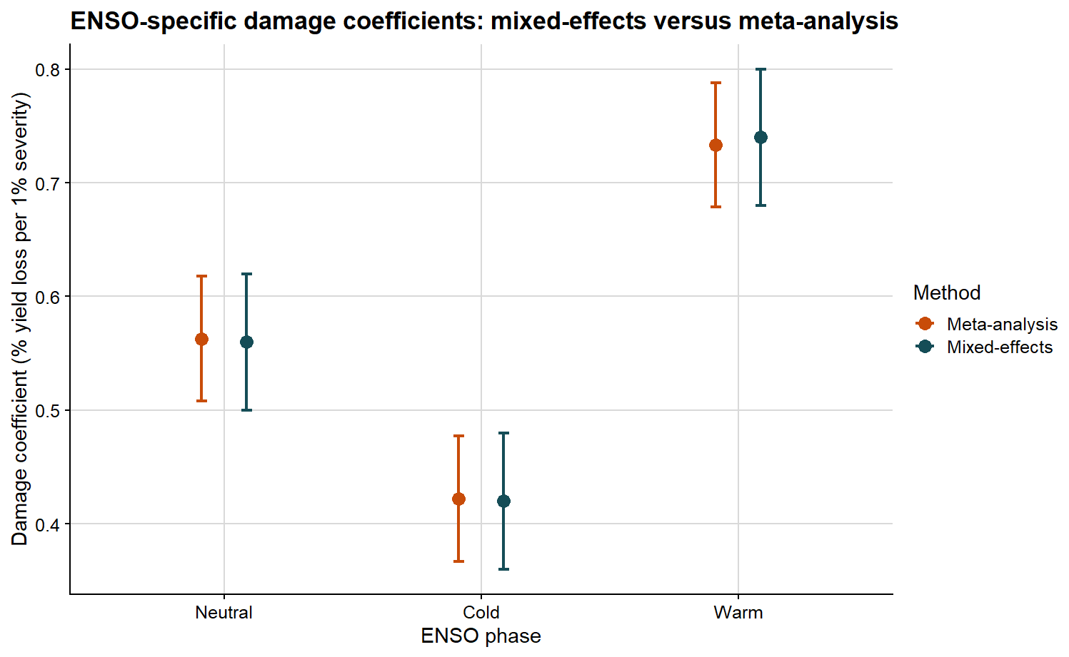 ggplot(phase_compare, aes(x = enso, y = estimate, color = method)) +# position dodge separates the two methods inside each ENSO phasegeom_point(position =position_dodge(width =0.35), size =3) +geom_errorbar(aes(ymin = ci_lb, ymax = ci_ub),position =position_dodge(width =0.35),width =0.08,linewidth =0.8 ) +scale_color_manual(values =c("Mixed-effects"="#154d57", "Meta-analysis"="#c84c09")) +background_grid() +labs(title ="ENSO-specific damage coefficients: mixed-effects versus meta-analysis",x ="ENSO phase",y ="Damage coefficient (% yield loss per 1% severity)",color ="Method" )