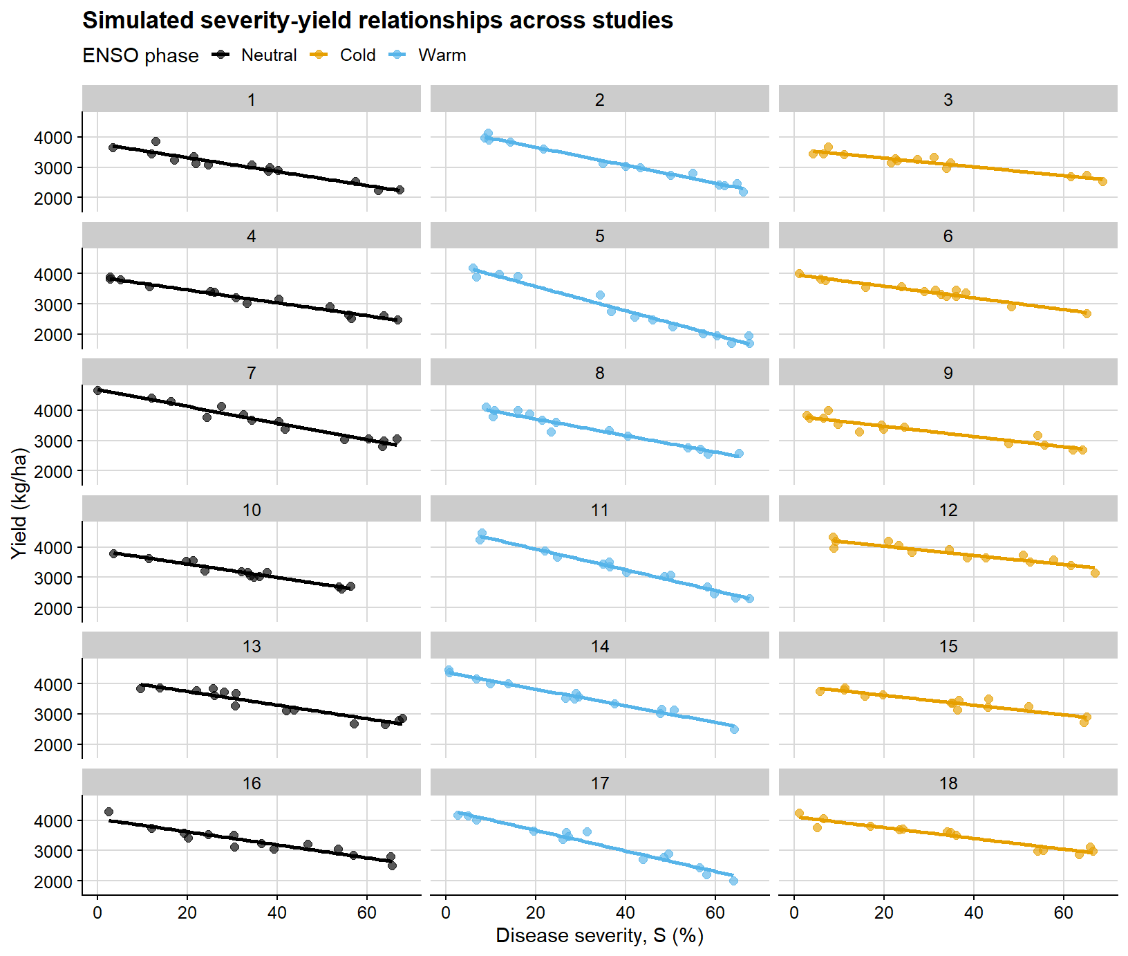 ggplot(damage_df, aes(severity, yield, color = enso)) +geom_point(alpha =0.65, size =2) +geom_smooth(method ="lm", se =FALSE, linewidth =1) +facet_wrap(~study, ncol =3) +scale_color_colorblind() +background_grid() +labs(title ="Simulated severity-yield relationships across studies",x ="Disease severity, S (%)",y ="Yield (kg/ha)",color ="ENSO phase" ) +theme(legend.position ="top")